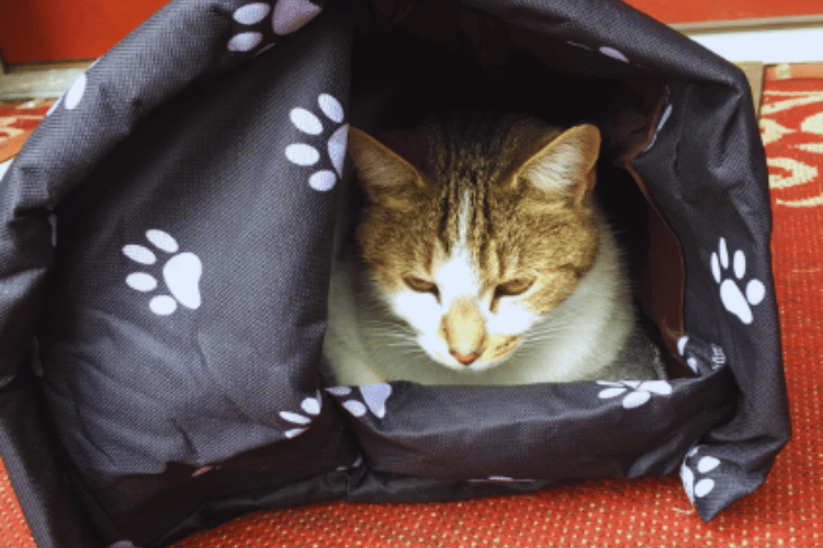 A cat's first night in a new environment can be stressful. To help them feel safe, provide a familiar-smelling blanket or pillow in their bed. This can help them settle in more quickly and reduce anxiety.