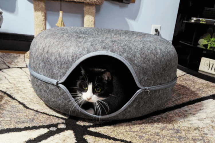 When considering where should cats sleep at night, providing a cozy bed is essential. A cat bed should be soft and warm, offering the warmth and comfort that felines seek. Placing the cat bed in a quiet corner where your kitty can feel safe and undisturbed is a great idea. Some cats may prefer a cardboard box lined with a small blanket, as it provides a sense of security and privacy.
