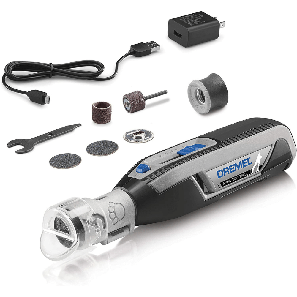 The Dremel PawControl Dog Nail Grinder also includes dog nail clippers and a dust collecting cap, a USB charging cable, and a user manual.