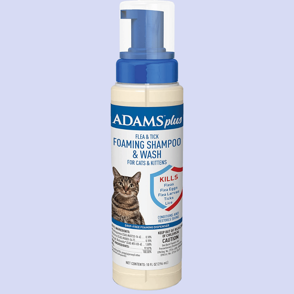 Adams Plus Flea & Tick Foaming Shampoo & Wash for Cats & Kittens is performance proven since 1975 and provides flea treatment, killing adult fleas and flea larvae on your cat or kitten to prevent reinfestation for up to 28 days.