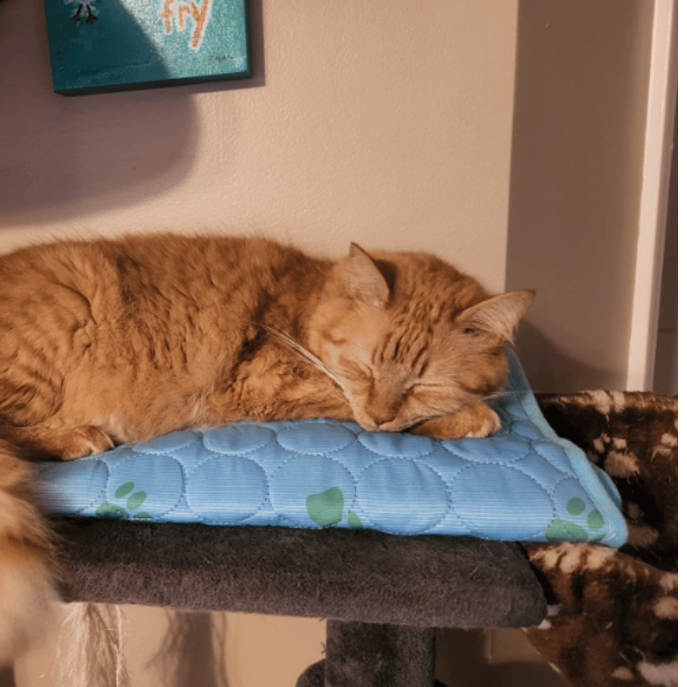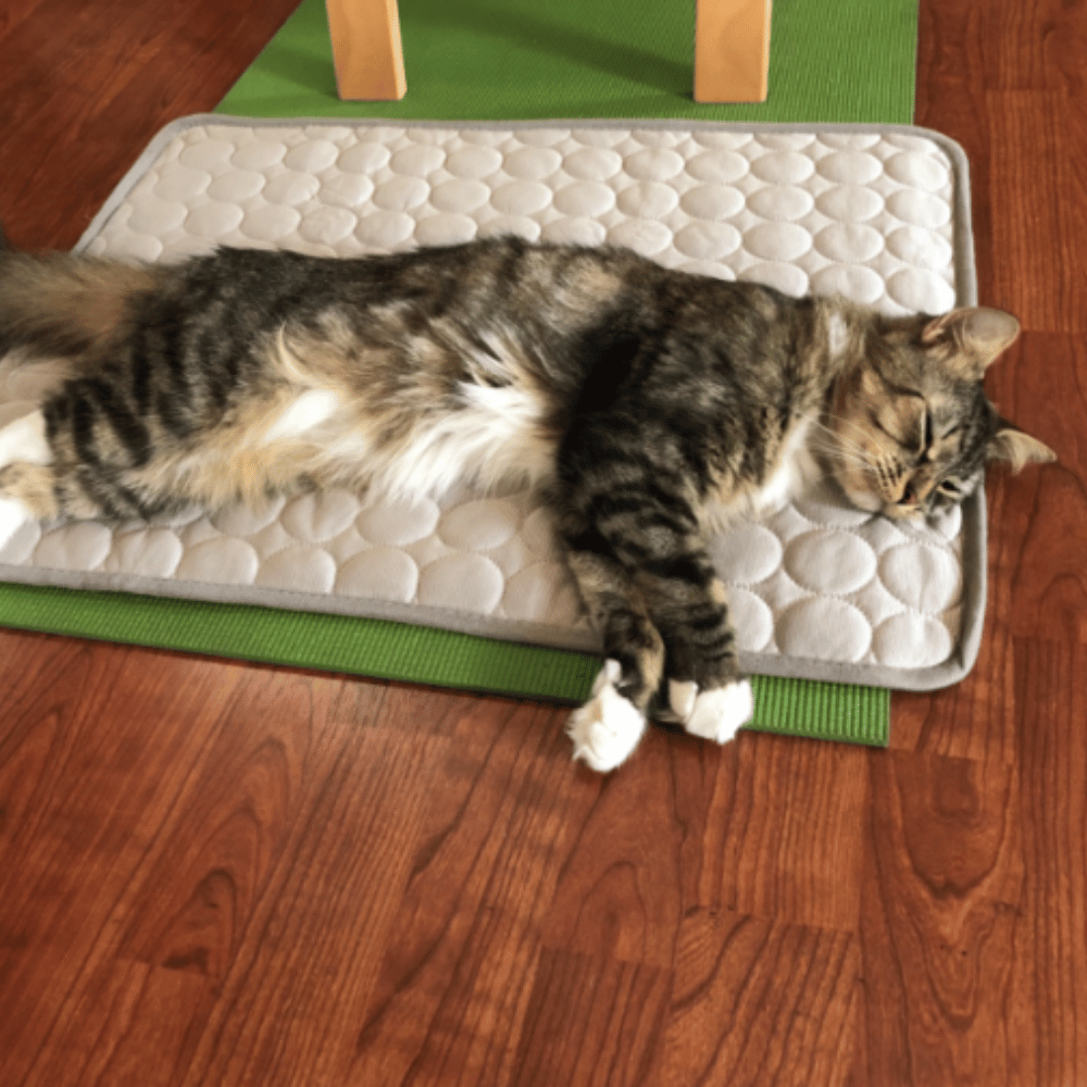 Gel-based cooling mats: Most gel mats are filled with a non-toxic gel material that absorbs heat from your cat's body and creates a cool surface for them to sit on. They do not require electricity and are portable.
