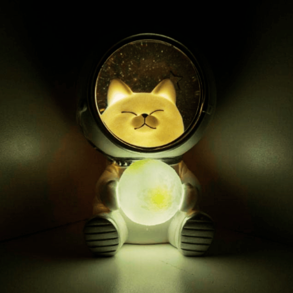 This adorable lamp is designed to look like a cute little kitten wearing a spacesuit and becoming an astronaut. It emits beautiful colors of light, making it a perfect decorative piece and night light for any room.