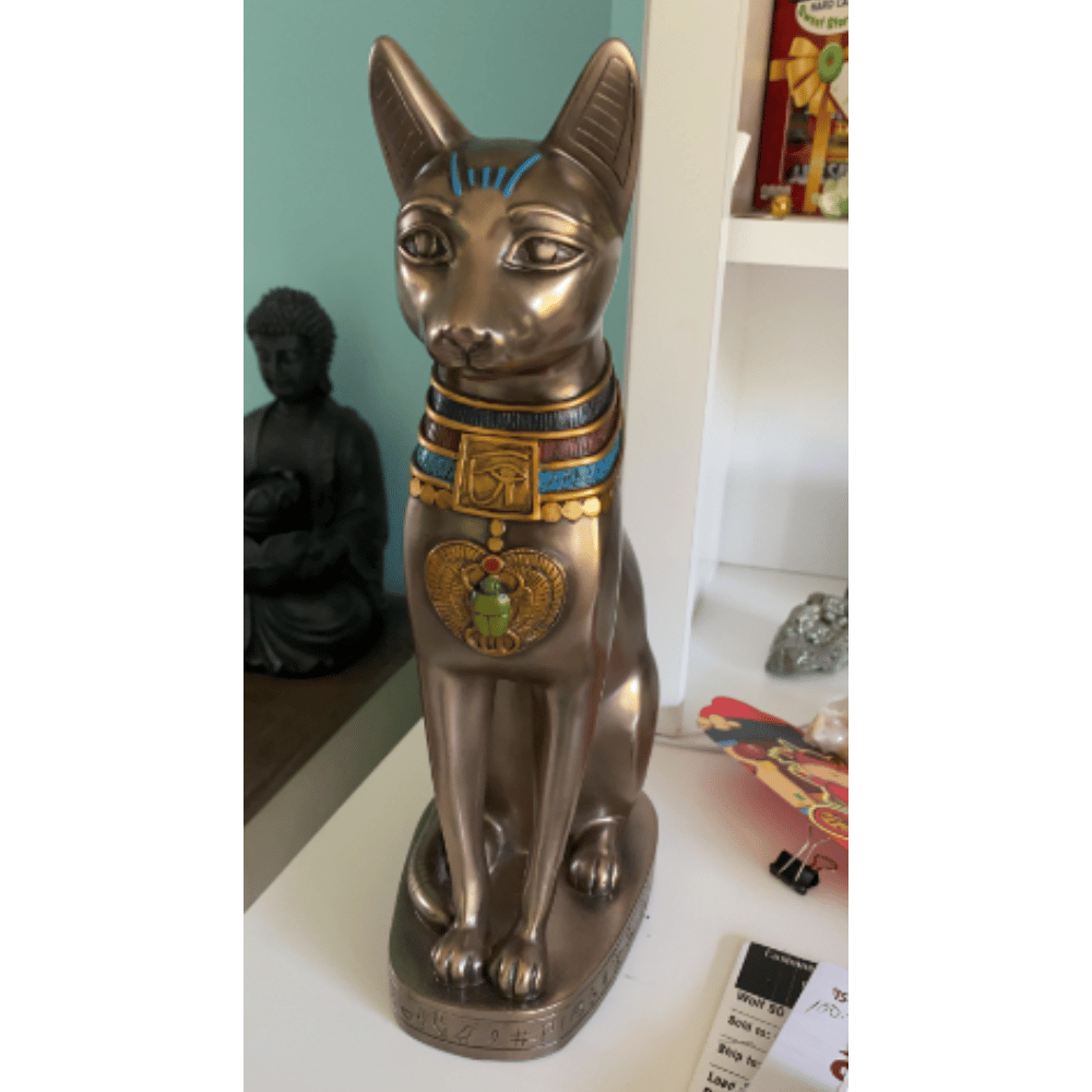 The Egyptian cat statue is known as a Bastet, which was a goddess in ancient Egyptian religion. She was associated with protection, fertility, and motherhood, and was often depicted as a woman with the head of a cat. Statues of Bastet were often placed at the entrances of homes and temples to protect against evil spirits.