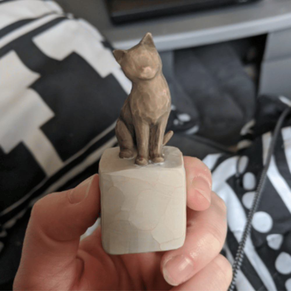 This sweet, hand-painted resin figure of a dark gray cat, perched atop a small pedestal, will sit perfectly on a shelf, table, or mantel, and will serve as a reminder of someone we want to keep close to or a memory we want to touch.