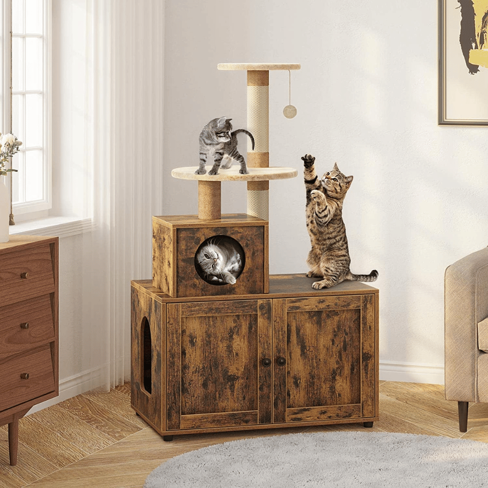 It's a two-in-one piece of furniture that meets two needs - a cat litter box and a cat tree - while also saving you twice the space. The rustic brown color blends in with your furniture style, and the surface is stain-resistant and easy to clean.