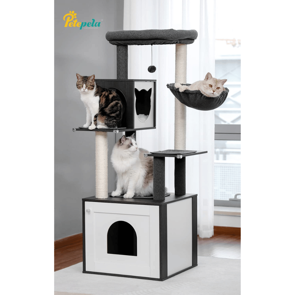 It's designed with a litter box enclosure and a modern cat tree, giving you the convenience of having both without taking up too much space. It's made of high-density wood, ensuring excellent stability and safety for your cats.