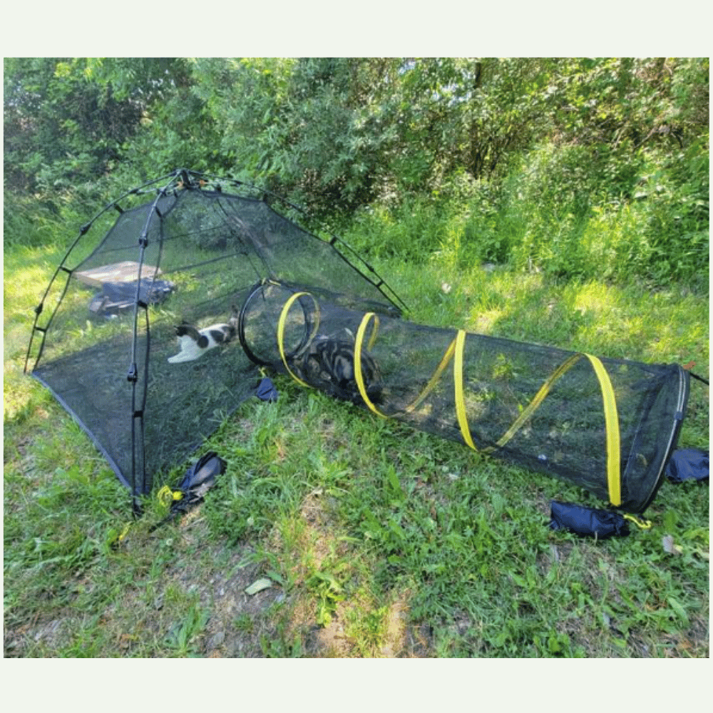 The tent and tunnel also include 4 tent pegs for staking down your outdoor cat enclosure and it is made of durable, high-quality mesh and can be quickly and easily set up in seconds.