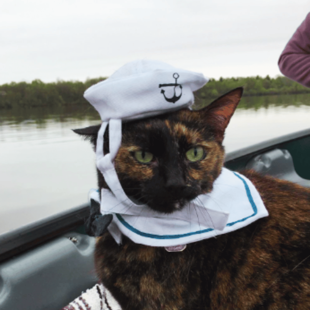 This unique costume is composed of a sailor hat and navy tie, made of soft and breathable polyester and cotton. The hat features slots for the ears and a Velcro buckle that will keep the hat securely on your cat's head.